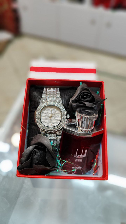 پککامل شامل: باکس+ساعت پتک فیلیپ فول نگین رنگ رندوم+ادکلن رندوم+گل رز